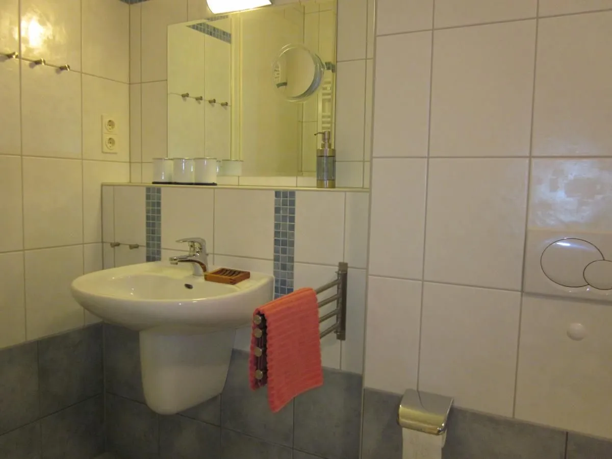 Das Badezimmer bietet sowohl Wanne als auch Dusche, einen Waschtisch und ein WC.