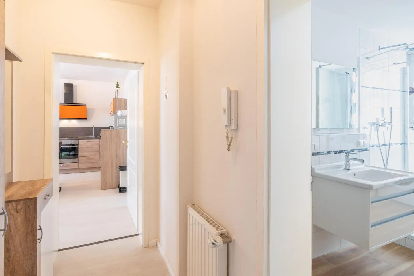 Die Küche ist ein Highlight der Ferienwohnung und bietet eine umfangreiche und hochwertige Ausstattung mit renommierten Marken wie WMF und Tefal. Hier können Sie Ihre Lieblingsgerichte zubereiten und gemeinsame Mahlzeiten genießen. Ein Flaschenwärmer steht ebenfalls zur Verfügung, um sicherzustellen, dass auch die kleinsten Gäste stets bestens versorgt sind.