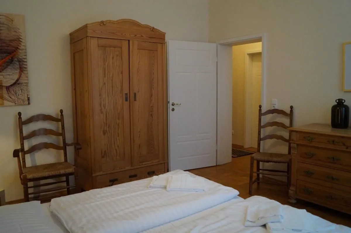 Es gibt zwei separate Schlafzimmer, die jeweils mit einem Doppelbett und Kleiderschrank ausgestattet sind. In einem der Schlafräume steht für die fünfte Person zusätzlich eine Schlafcouch zur Verfügung (Liegefläche ca. 1,40m breit).