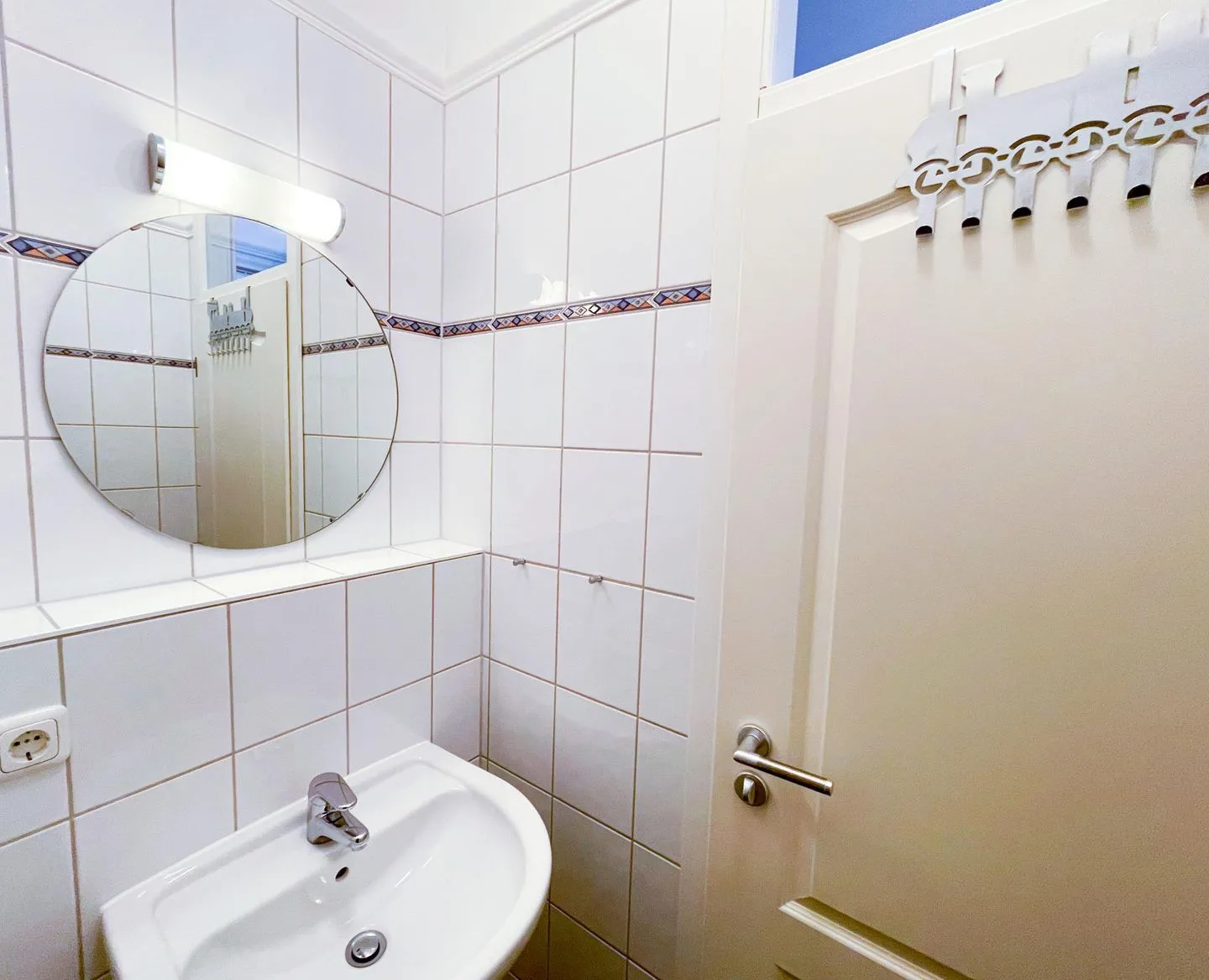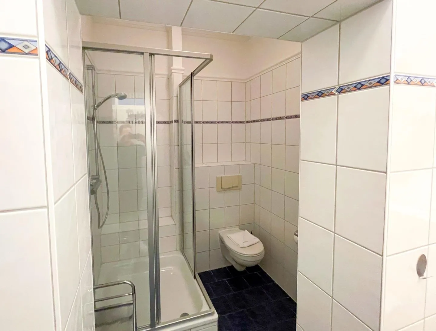 Das Badezimmer ist mit Dusche, Waschbecken und WC ausgestattet. Ein Fön ist vorhanden.