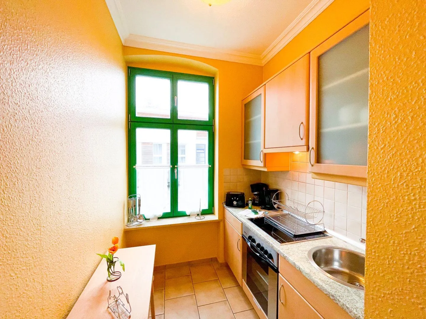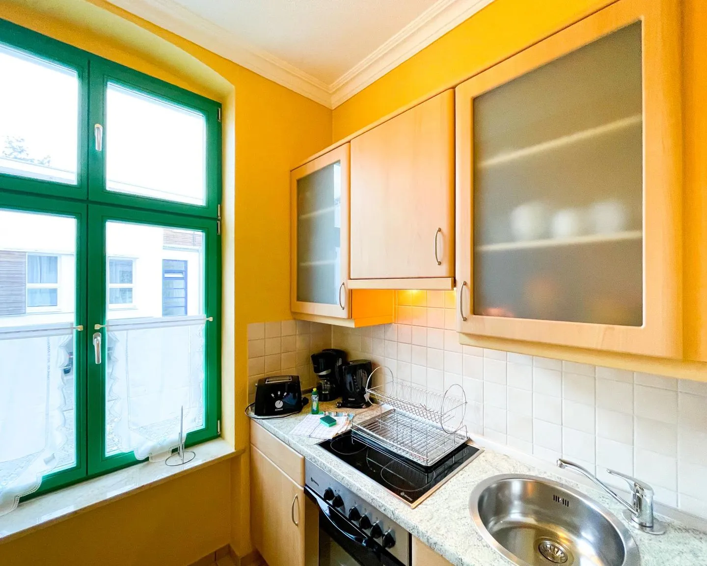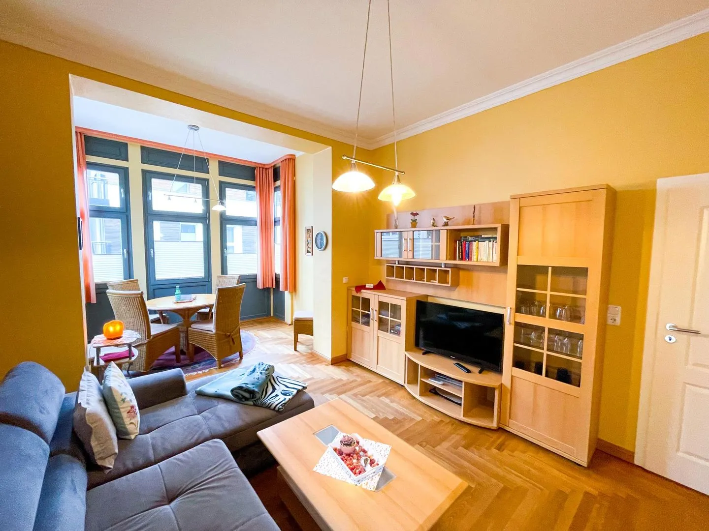 Die Villa Perkunos wurde im typischen Stil der Bäderarchitektur aufwendig saniert und bietet heute geschmackvoll und hochwertig ausgestattete Ferienwohnungen unterschiedlicher Größe. Die ca. 53 m² große Ferienwohnung liegt im Hochparterre auf der Südseite des Hauses und bietet ausreichend Platz für bis zu vier Personen. Sie besteht aus einem gemütlichen Wohnzimmer mit Schlafmöglichkeit für zwei Personen, einem separaten Schlafzimmer mit Doppelbett sowie über eine separate, komplett ausgestattete Küche und einem Badezimmer. Ein PKW Stellplatz befindet sich auf dem Grundstück. Eine Waschmaschine und ein Wäschetrockner stehen gegen Gebühr zur Verfügung.
