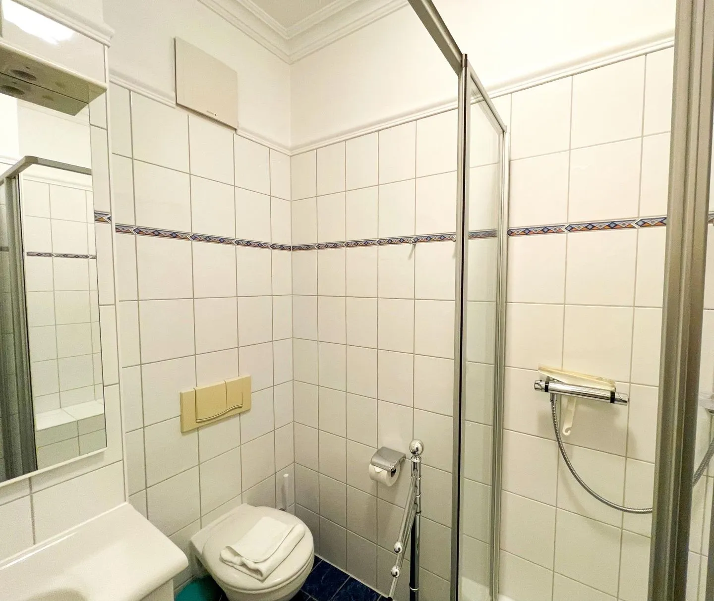 Das Badezimmer verfügt über Dusche, Waschbecken und WC. Auch ein Fön ist vorhanden.