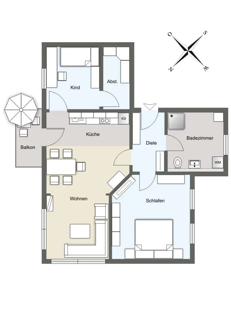 Herzstück der Wohnung ist der geräumige Wohn-/Essraum mit separater Sitz- und Essecke. Die Küche ist komplett ausgestattet und verfügt über ein Cerankochfeld, einen Backofen, eine Geschirrspülmaschine sowie einen Kühlschrank mit Tiefkühlfach.