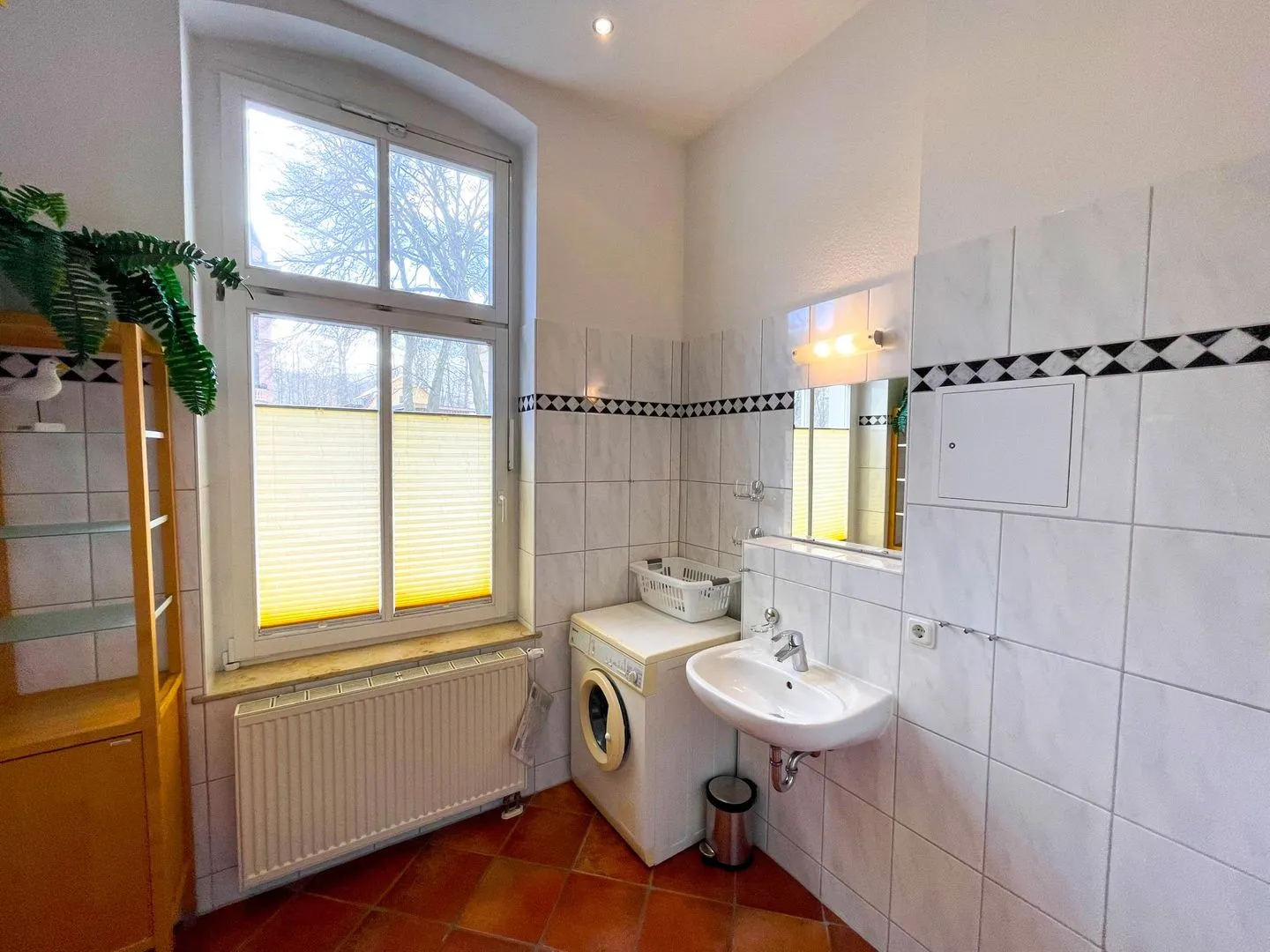 Im Badezimmer stehen dem Gast neben der erwähnten Waschmaschine Dusche, Waschbecken und WC zur Verfügung. Große Fenster sorgen für ausreichend Frischluftzufuhr. Ein Fön ist vorhanden.