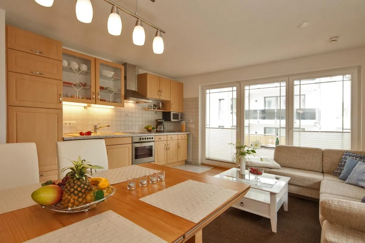 Das Wohnzimmer ist mit einer gemütlichen Sitzecke ausgestattet. Von hier aus betreten Sie einen der beiden geschützten Balkone. Im Wohnraum befindet sich auch die integrierte Küchenzeile, die kaum einen Wunsch offen läßt. Die separate Essecke befindet sich neben der schönen Anrichte - alles Möbel aus Echtholz.