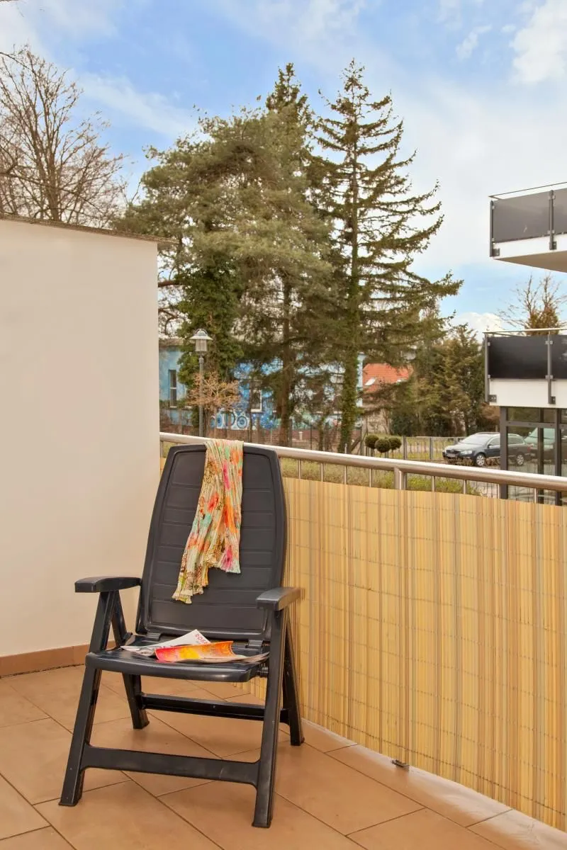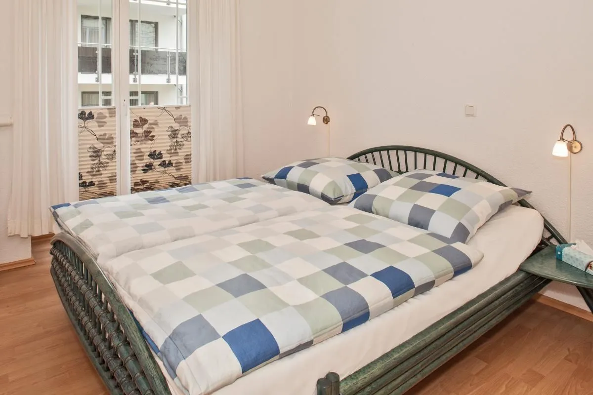 Im größeren der beiden Schlafzimmer steht ein Doppelbett sowie ein geräumiger Kleiderschrank. Die bodentiefen Fenster lassen sich durch Plissee-Rollos gut verdunkeln. In dem kleineren Schlafraum befindet sich ein Einzelbett, unter dem eine zusätzliche Matratze ausgezogen werden kann. Geeignet ist dieses Zimmer für zwei Kinder oder einen erwachsenen Gast. Auch steht ein Kleiderschrank.