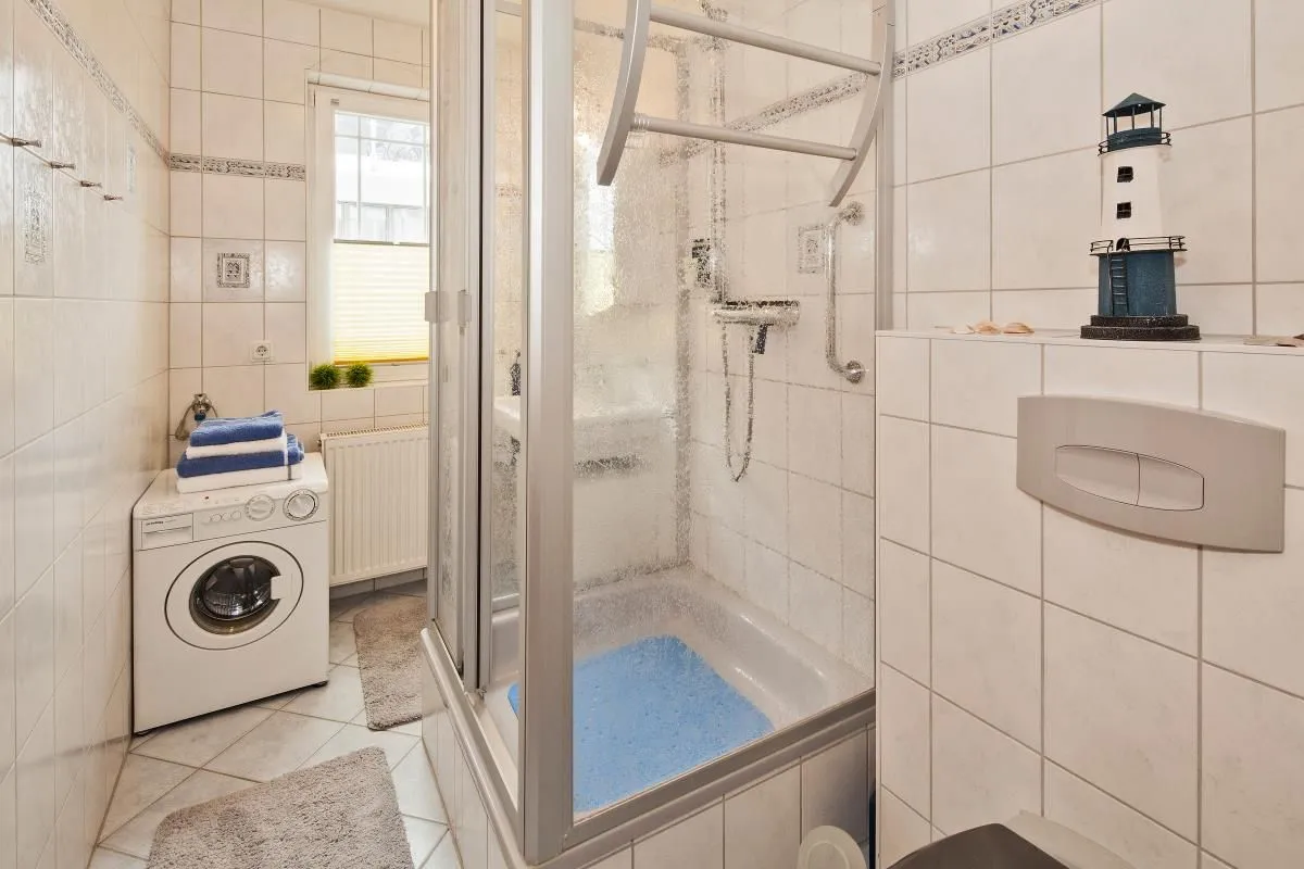 In dem geräumigen Tageslicht-Badezimmer stehen neben Dusche, Waschbecken und WC eine eigene Waschmaschine zur Verfügung. Diese kann unentgeltlich genutzt werden.