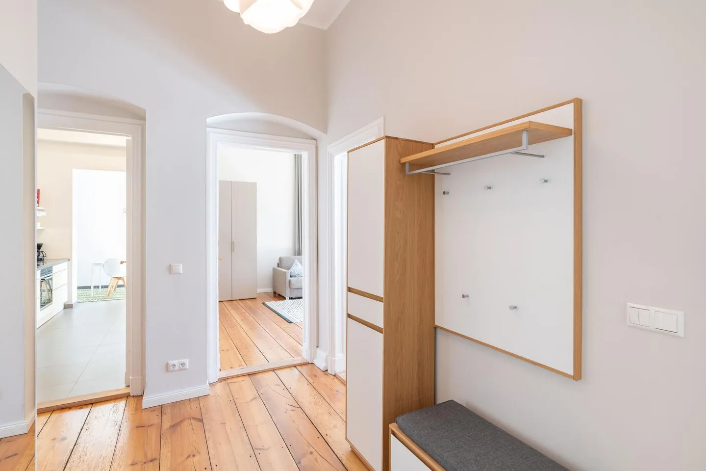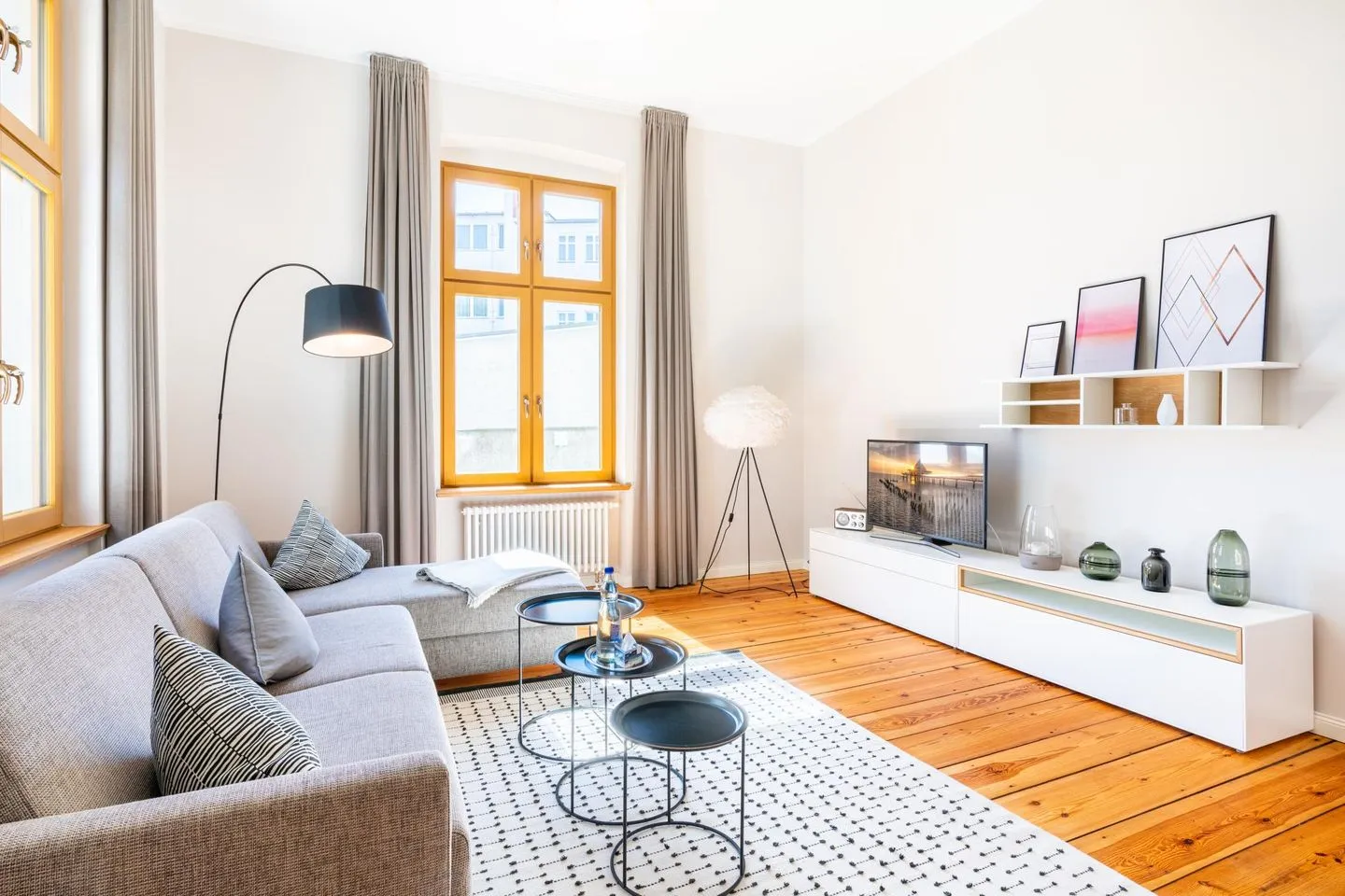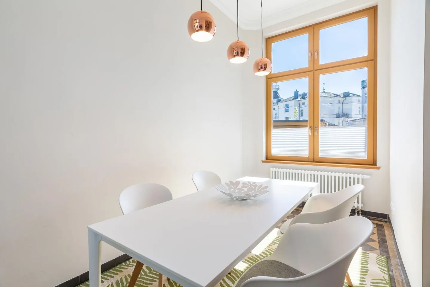Ihren Lieblingsplatz finden Sie in der im Erdgeschoss befindlichen Ferienwohnung in der kleinen Veranda. Praktischerweise direkt neben der Küche gelegen können Sie hier Ihr Frühstück in der Morgensonne genießen. Oder Sie leisten dem Koch Gesellschaft, der sich in der mit Markengeräten ausgestatteten modernen Einbauküche stilvoll verwirklichen kann.Moderne Möbel im nordischen Stil verleihen den lichtdurchfluteten hohen Wohnräumen eine nahezu unbeschwerte Leichtigkeit. Der aufwendig gearbeitete Holzfußboden unterstreicht die natürliche Wohnatmosphäre und lässt den Aufenthalt zu jeder Jahreszeit zum Wohlfühlerlebnis werden.