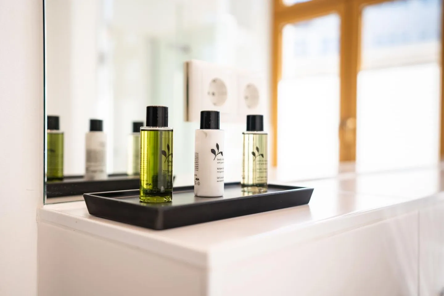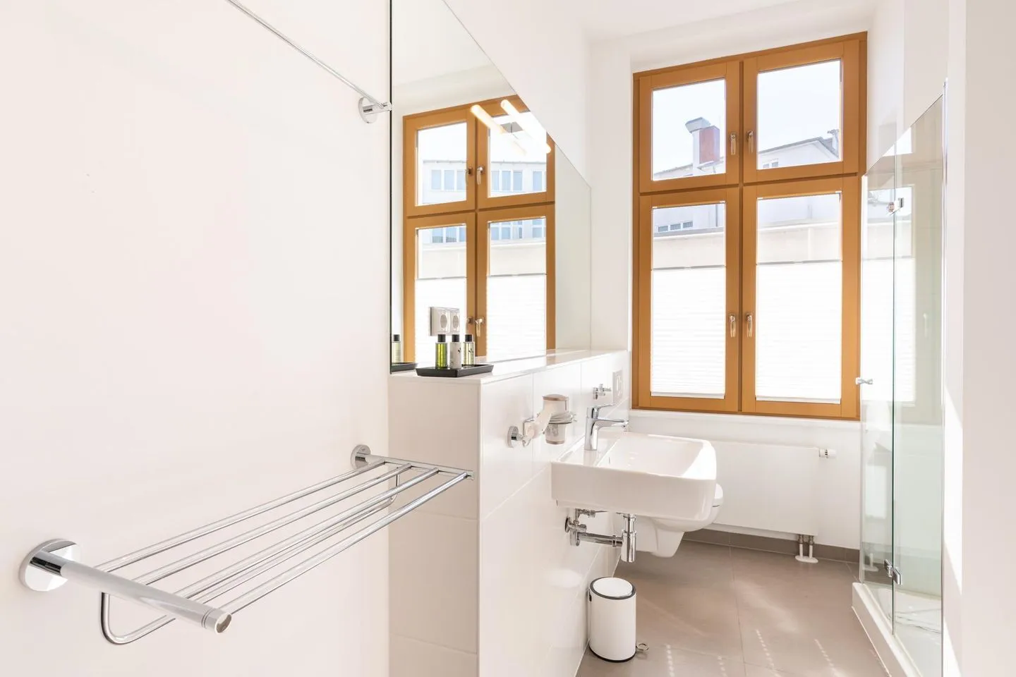 Das moderne Badezimmer mit Tageslicht verfügt über Dusche und WC sowie einen Heizkörper als Handtuchwärmer. Neben Handtüchern liegt auch eine Erstausstattung an Pflegeprodukten bereit.