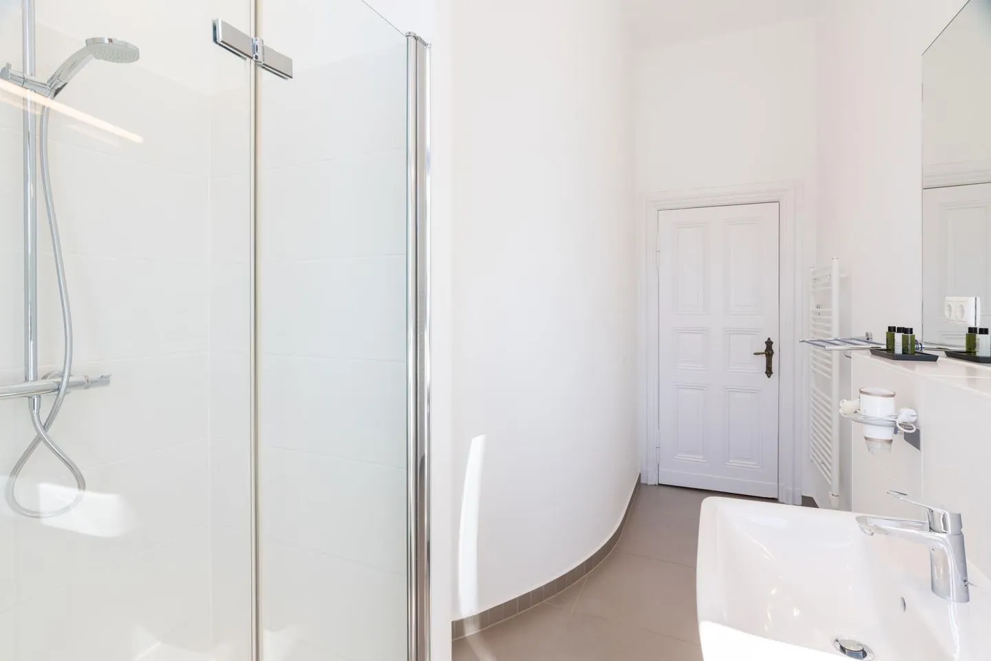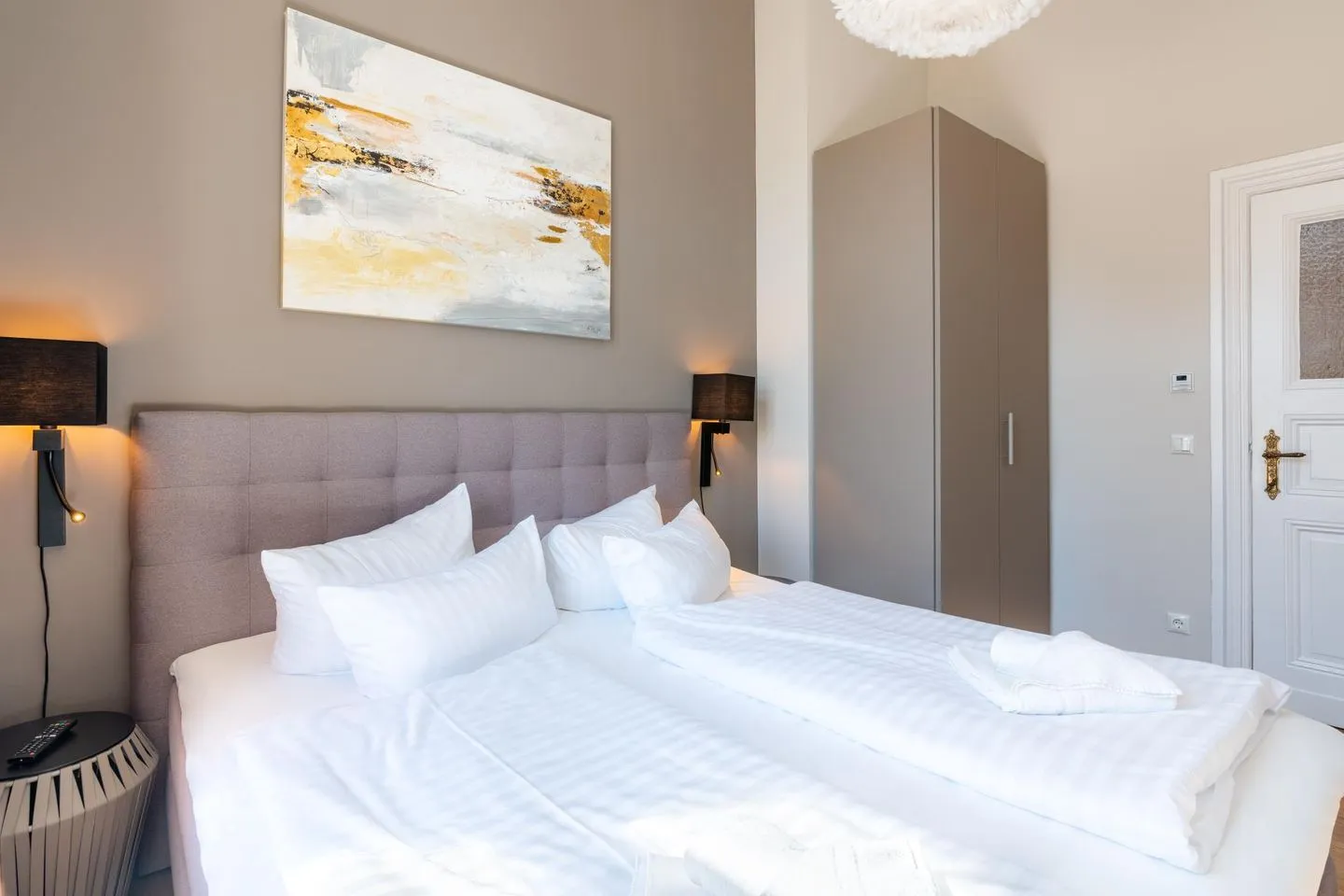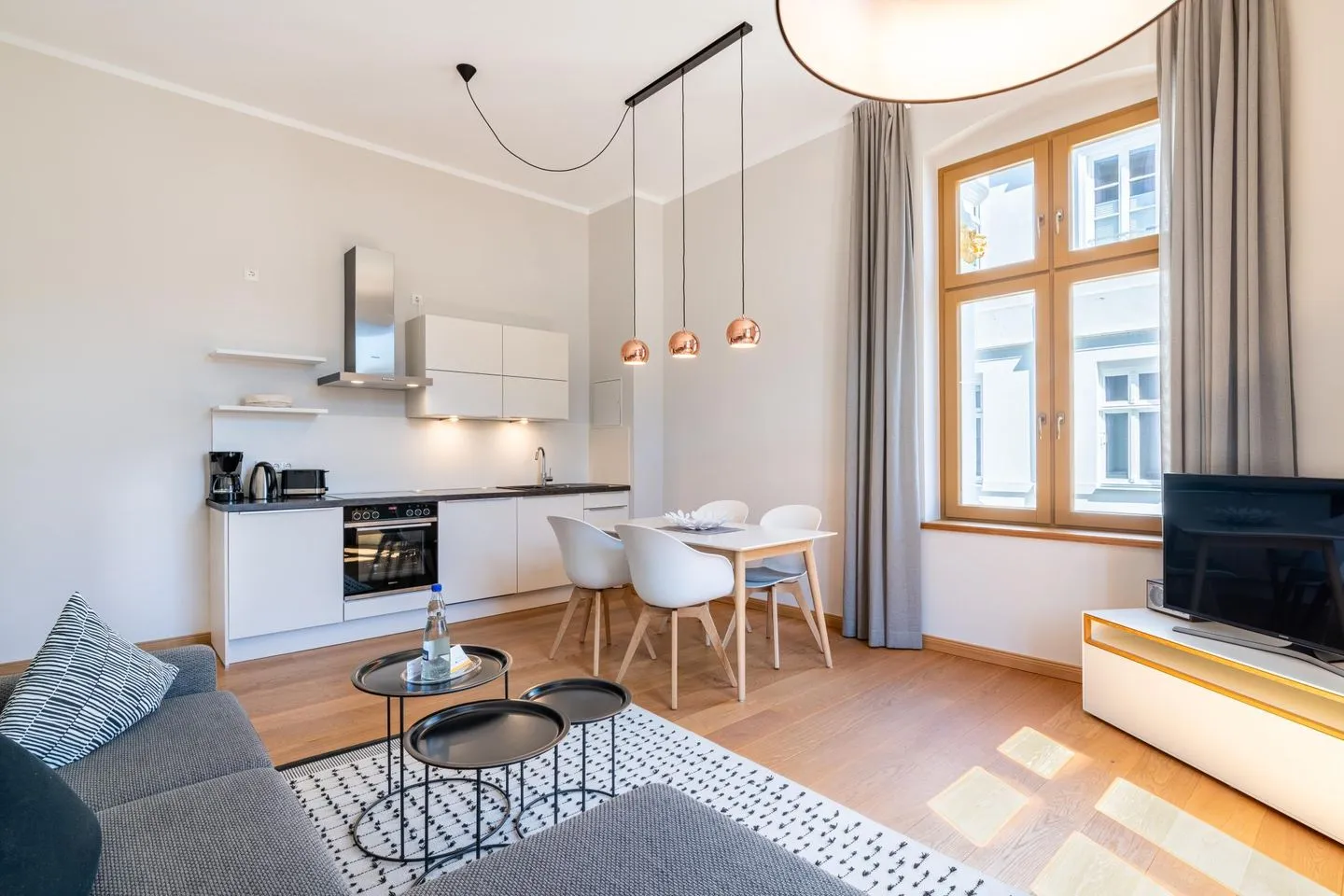 Auch auf dieser Etage sorgen die hohen, lichtdurchfluteten Räume für eine Wohnatmosphäre der ganz besonderen Art. In der Villa Marie wurde der Charakter des alten Hauses geschmackvoll kombiniert mit den modernen Ansprüchen von heute. Im großzügigen Wohnzimmer gibt es neben einer gemütlichen Sitzecke einen modernen Smart-TV, der ein vielfältiges Unterhaltungsprogramm garantiert. Eine Schlafcouch bietet Platz für einen dritten Übernachtungsgast. Die moderne Einbauküche ist mit hochwertigen Markengeräten ausgestattet und lässt kaum einen Wunsch offen. Ein schöner Essplatz befindet sich in unmittelbarer Reichweite.