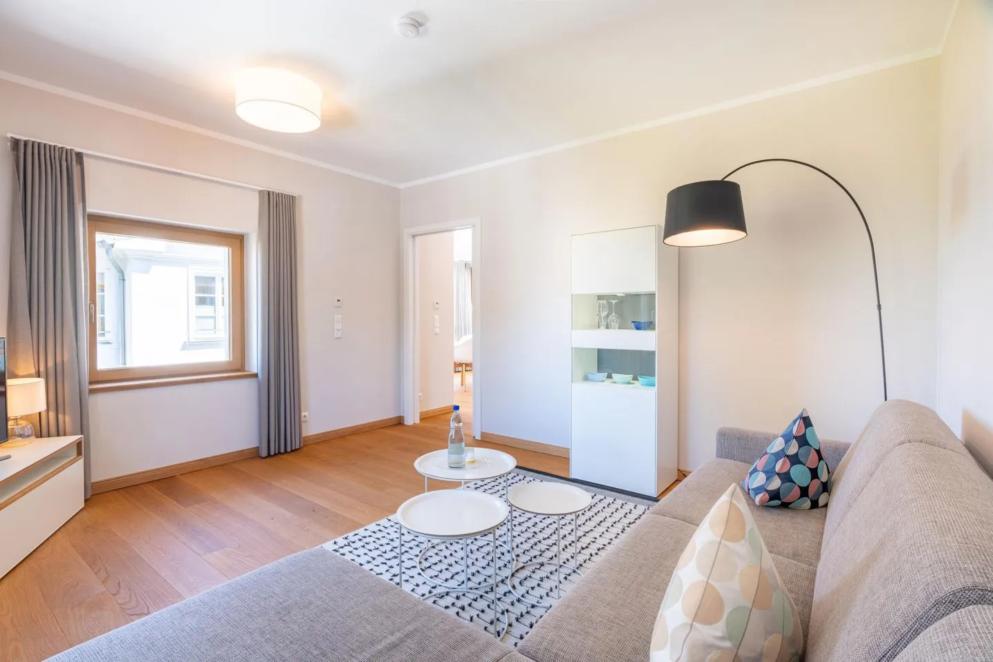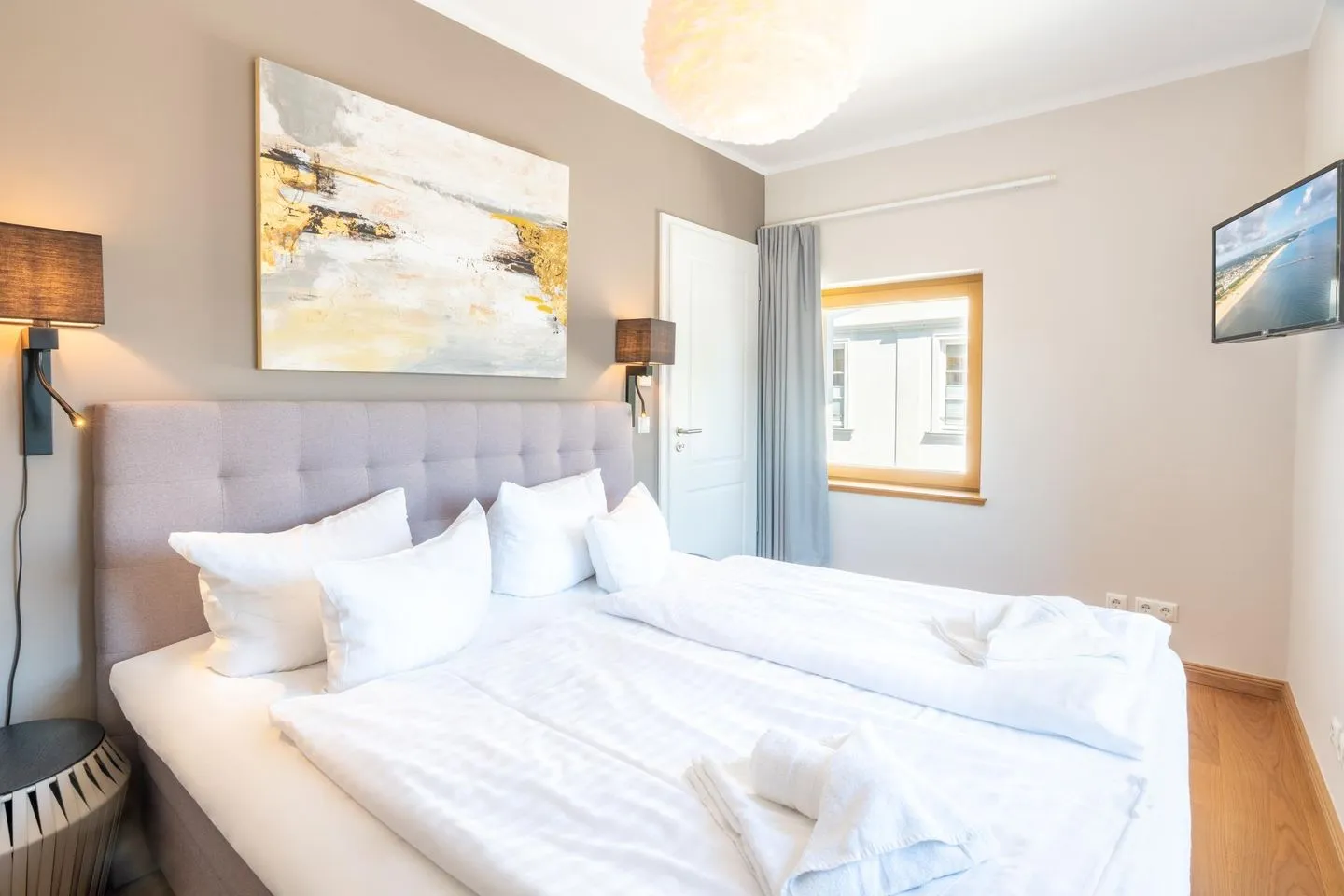 Das separate Schlafzimmer verfügt neben einem hochwertigen Box-Springbett über einen Smart-TV. Die hochwertige Sitzgarnitur im Wohnzimmer ermöglicht geruhsamen Schlaf für zwei weitere Gäste. Das Wohnzimmer kann durch eine Tür verschlossen werden und stellt somit einen vollwertigen Schlafraum dar. Damit Sie Ihren Aufenthalt von Beginn an genießen können, sind die Betten bei Ihrer Ankunft bereits bezogen.