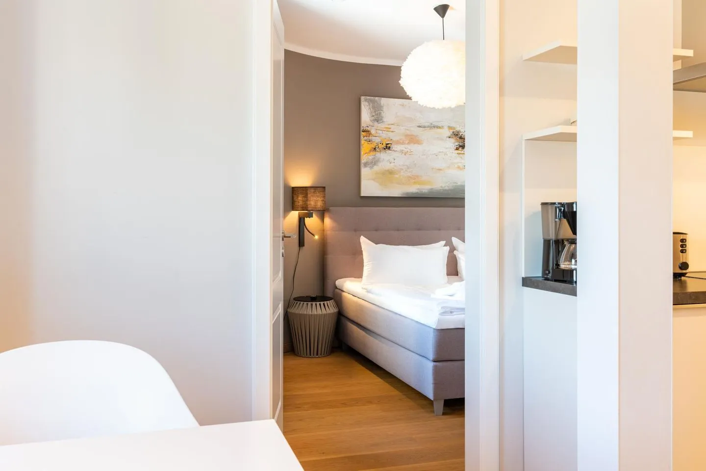Im separaten Schlafzimmer stehen ein schönes Boxspring-Bett sowie ein großer Smart-TV zur Verfügung. Die Urlaubsgarderobe findet ihren Platz in dem eingebauten Wandschrank.