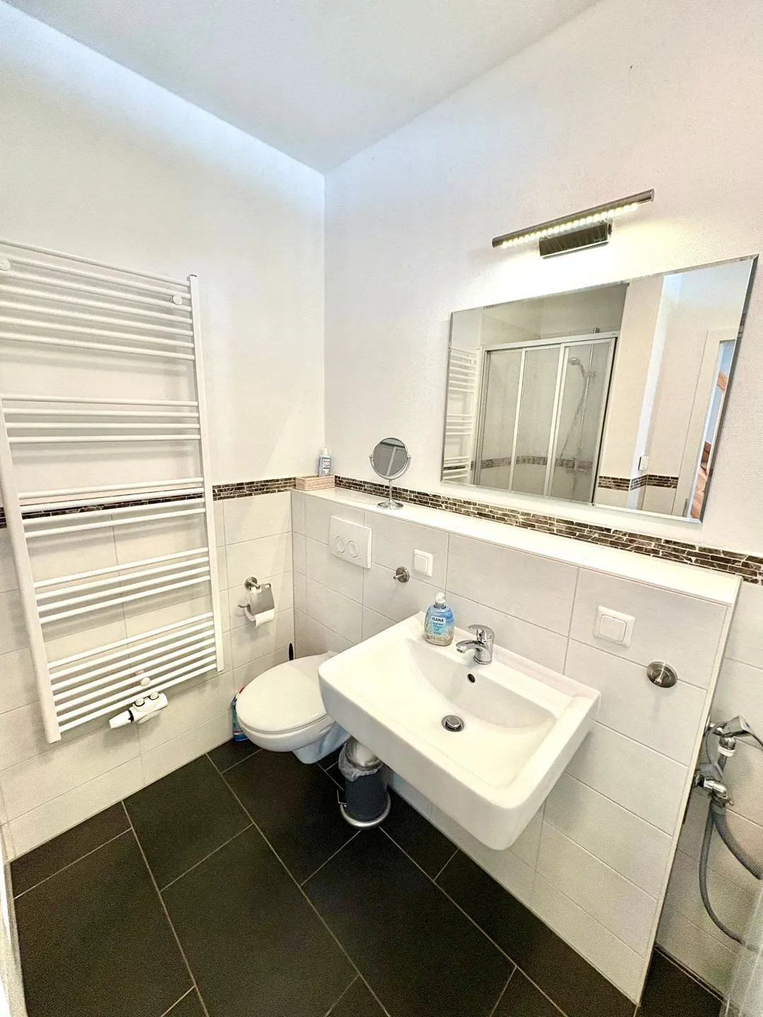 In den zwei Badezimmern stehen jeweils eine Dusche, Waschbecken, WC, Badetücher und Handtücher zur Verfügung. Beide Badezimmer sind modern gestaltet und bieten zusätzliche Annehmlichkeiten wie einen Kosmetikspiegel, Haartrockner, einen Ganzkörperspiegel und Wärmezufuhr über die Fußbodenheizung.