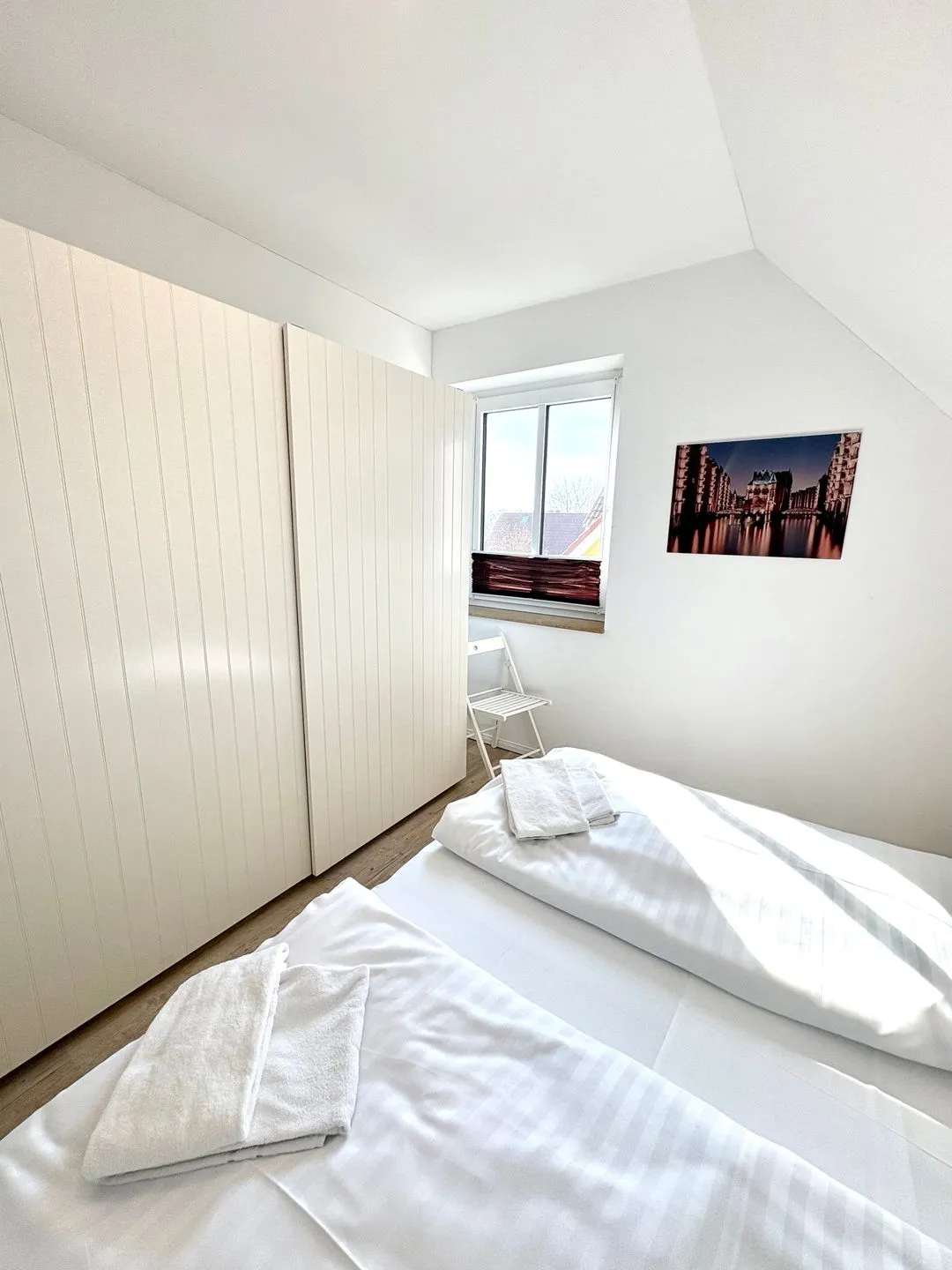 Das Haus verfügt über insgesamt drei Zimmer, darunter zwei komfortable Schlafzimmer. Eines der Schlafzimmer ist mit zwei Einzelbetten ausgestattet, das andere mit einem großen Doppelbett (Breite über 180 cm). Für einen angenehmen Schlafkomfort sorgen Verdunkelungsmöglichkeiten, Fliegengitter an den Fenstern und hochwertige Bettwäsche. Ein Kleiderschrank ist ebenso vorhanden wie weitere Ablagemöglichkeiten.