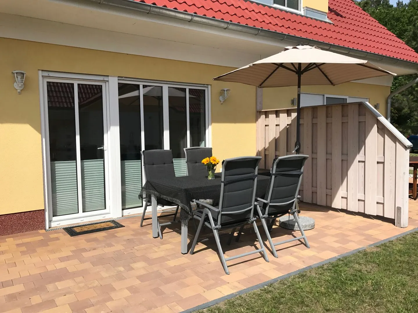 Der Außenbereich überzeugt mit einer überdachten Terrasse, Gartenmöbeln, Sonnenschirm und einem gepflegten Garten. Ein Gartenhaus bietet Raum für die Aufbewahrung von Fahrrädern oder Angelausrüstung. Das Grundstück ist mit Sichtschutz für alle Fenster ausgestattet, sodass die Privatsphäre stets gewahrt bleibt.