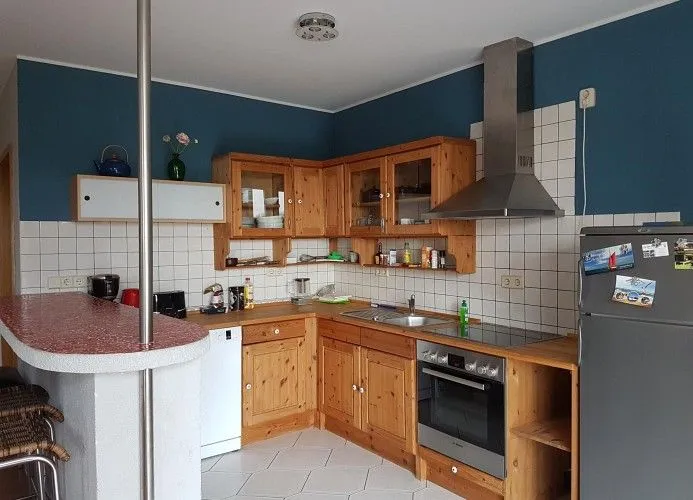 Die voll ausgestattete Küche lässt keine Wünsche offen. Ausgestattet mit einer modernen Kaffeemaschine, einem Toaster und einem Wasserkocher, können Sie hier entspannt in den Tag starten. Der hochwertige Bosch 4-Platten Herd mit Backofen sowie der Kühlschrank mit Gefrierfach und der Geschirrspüler machen die Zubereitung und Aufbewahrung Ihrer Mahlzeiten zu einem Kinderspiel. Hier können Sie Ihre kulinarischen Fähigkeiten entfalten und gemeinsam im gemütlichen Essbereich genießen.