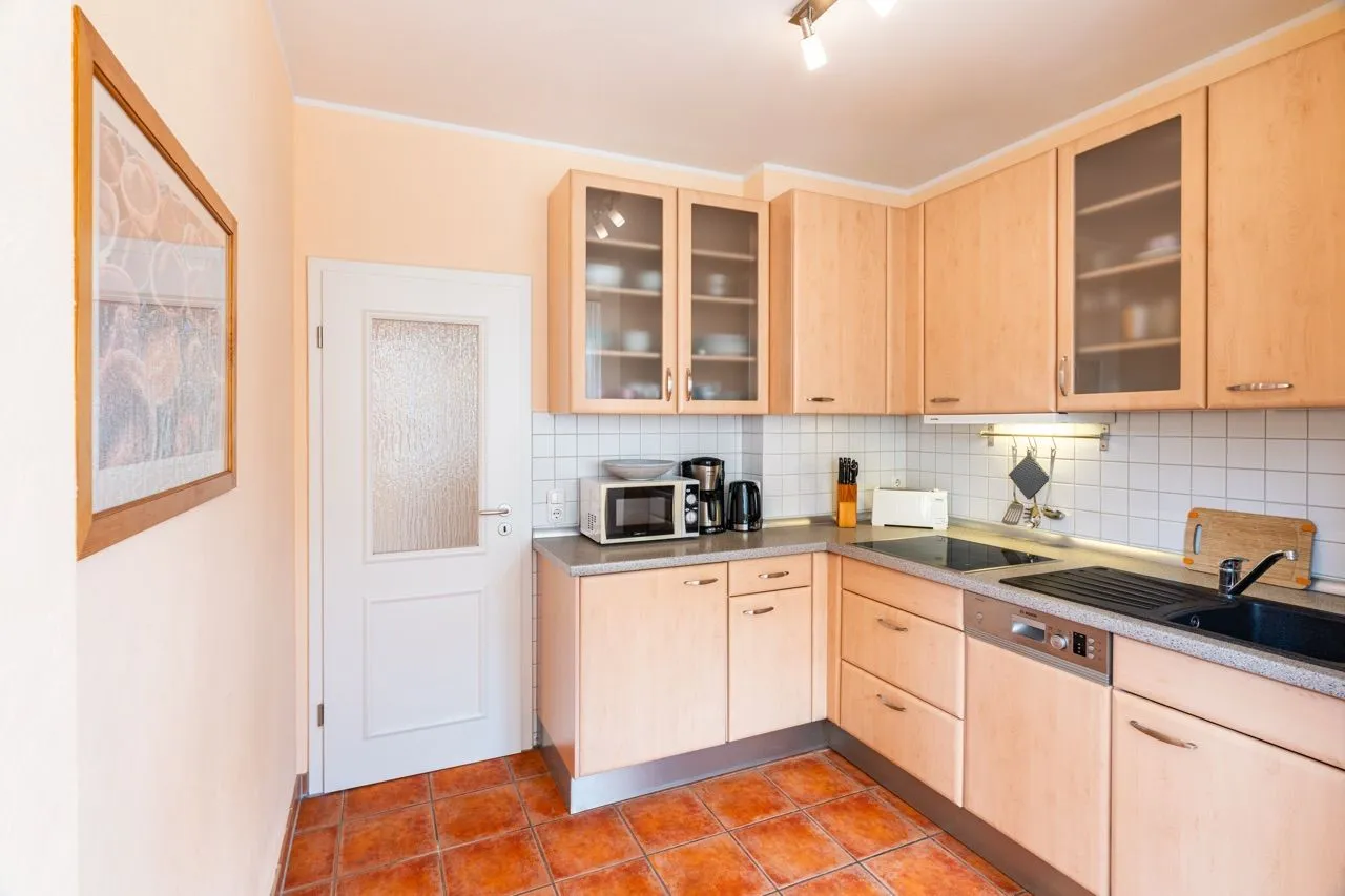 Der Wohnbereich ist optisch von der Küche getrennt und lässt sich somit auch hervorragend als zweites Schlafzimmer nutzen. Echtholzmöbel, hochwertige Sitzgelegenheiten aus Leder sowie modernste TV-Technik laden zum Verweilen ein. Die Küche ist komplett ausgestattet und lässt kaum einen Wunsch offen.