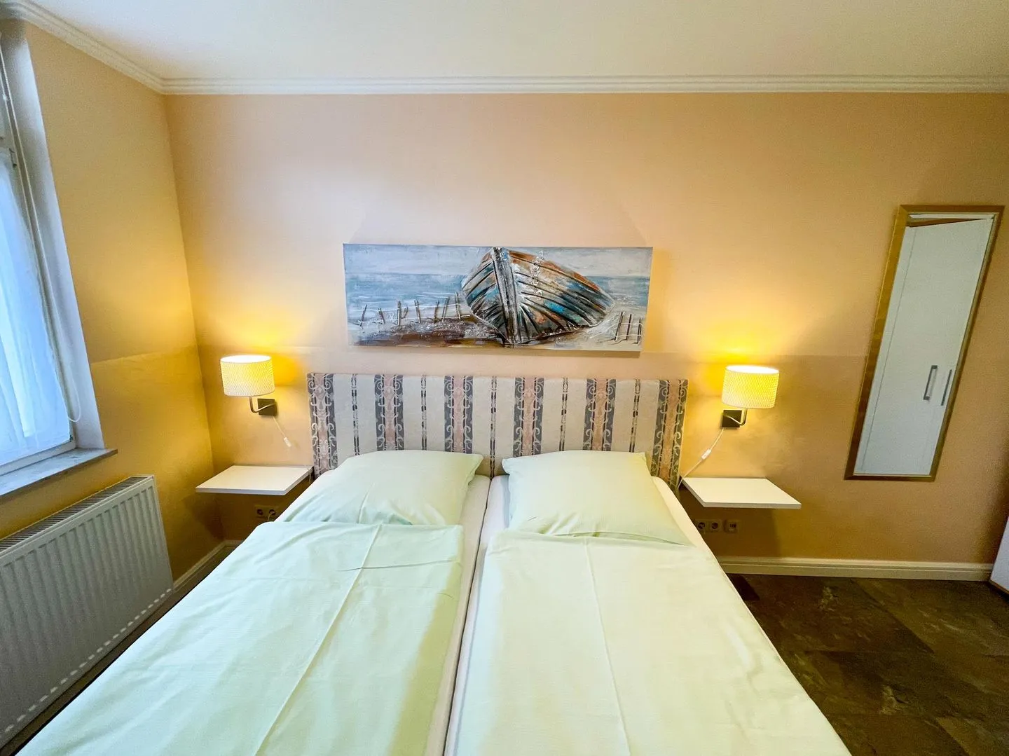 Im größeren der beiden Schlafräume freut sich der Gast über das komfortable Doppelbett mit zwei getrennten Matratzen und hoher Einstiegshöhe. Der kleinere Schlafraum dient tagsüber auch als Rückzugsort: ausgestattet mit einer kleinen Bibliothek und einem zweiten Flachbild-TV ist hier gute Unterhaltung garantiert. Für die Nacht kann die bequeme Couch zum Bett umgebaut werden.