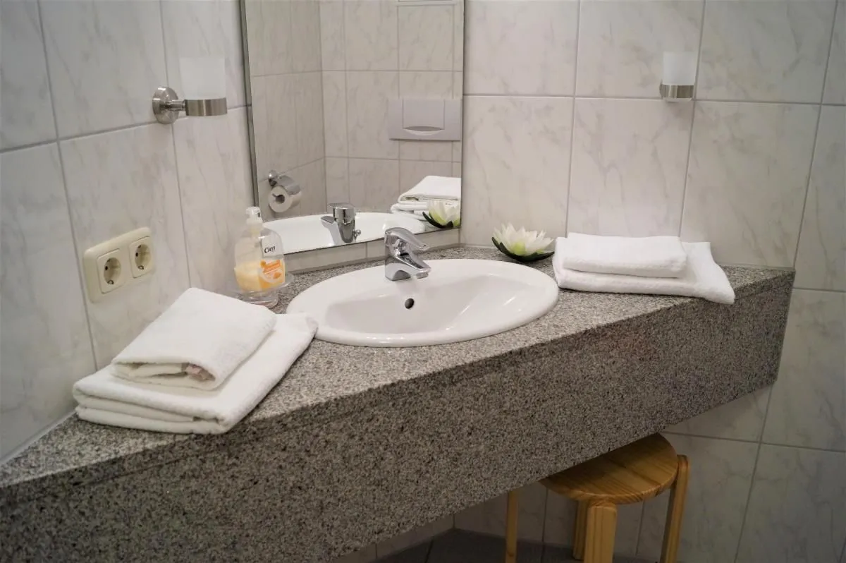 Das komfortable Bad hat eine Dusche, ein Waschbecken und ein WC. Es gibt natürlich auch einen Hand-Fön.