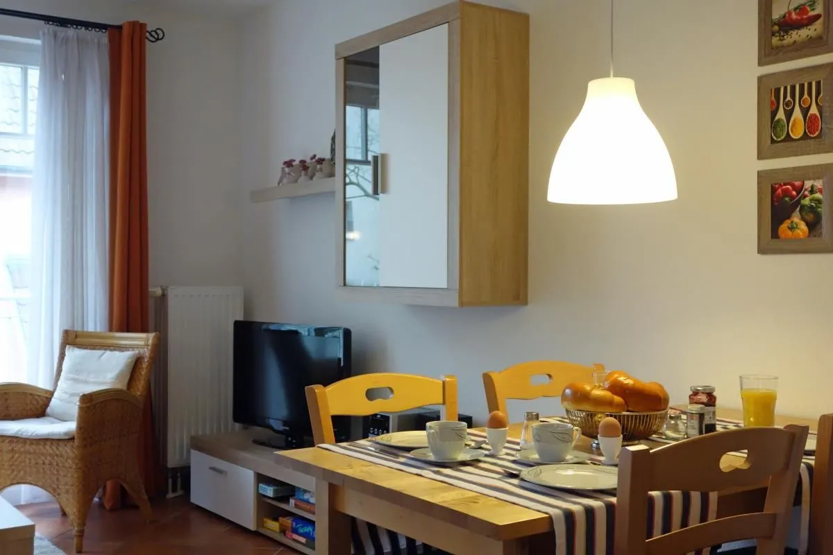 Im Wohnraum gibt es einen gemütlichen Sitzbereich mit einer Couch, die ausgezogen eine Schlafmöglichkeit für maximal zwei Kinder oder einen erwachsenen Gast bietet. Die Küche selbst ist mit Backofen, Ceran-Kochfeld, Mikrowelle sowie Geschirrspülmaschine ausgestattet. Ein "XXL-Kühlschrank" ermöglicht die unproblematische Vorratshaltung auch im Urlaub.