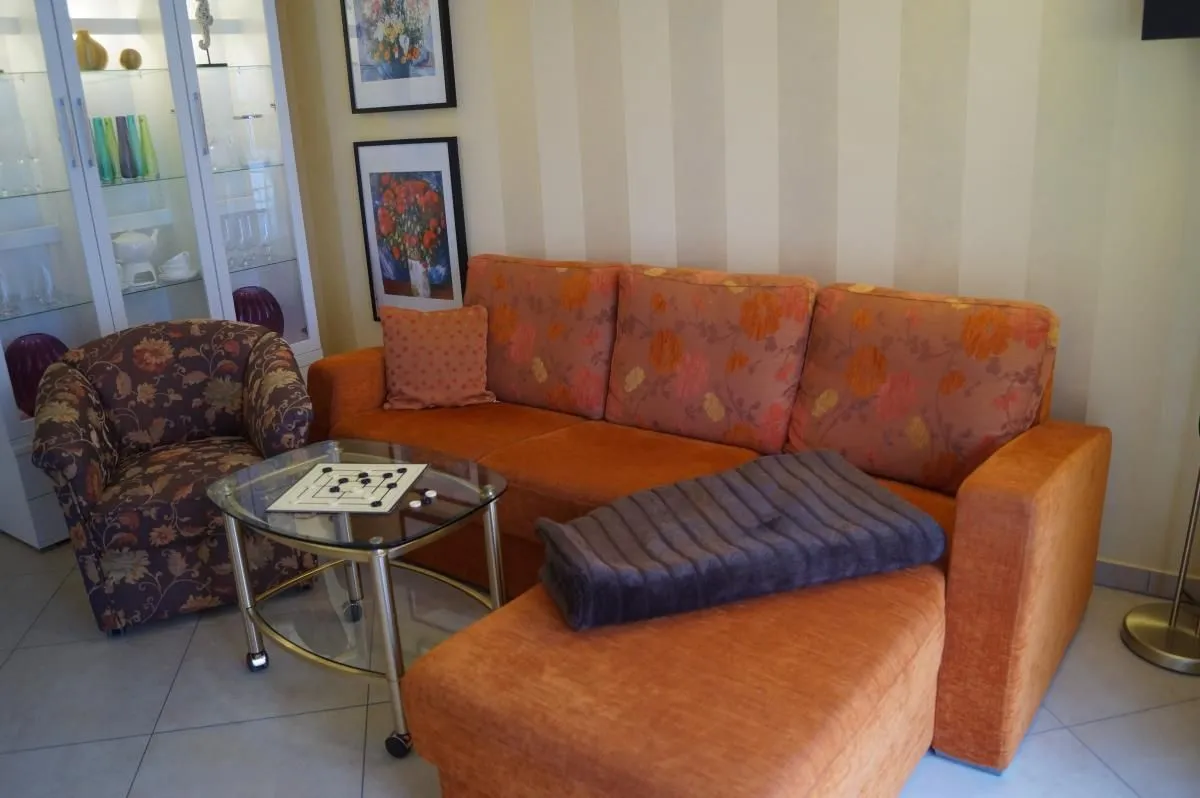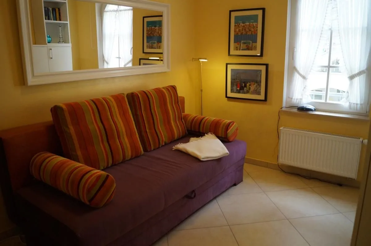 In einem zweiten kleineren Schlafzimmer kann das vorhandene Sofa zu einem Schlafplatz für zwei weitere Gäste umfunktioniert werden (Liegefläche 160 cm x 200 cm). Neben einer Kommode für die Urlaubsgarderobe gibt es hier außerdem einen zweiten Flachbild-Fernseher.
