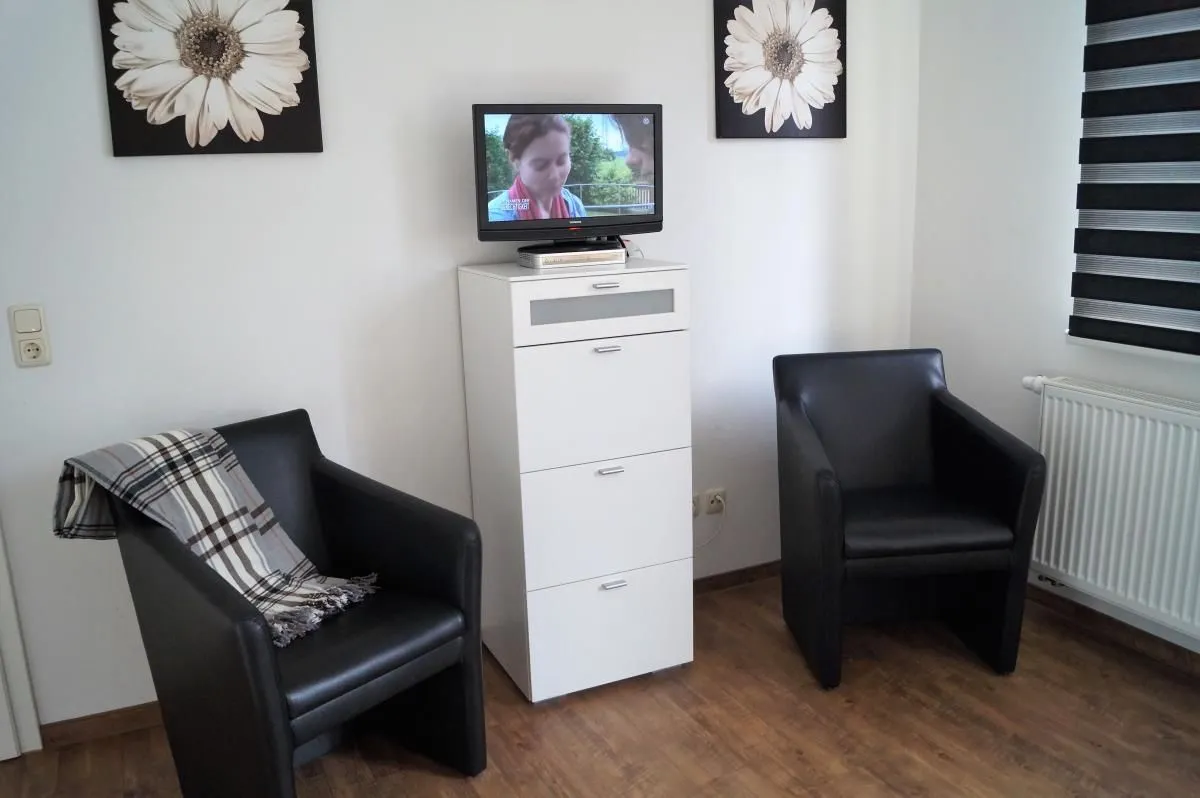 Ein Schlafzimmer ist mit einem Doppelbett (1,80 er Breite) und einem großen Kleiderschrank ausgestattet. Ein Flachbild-Fernseher sowie eine kleine Leseecke machen diesen Raum auch tagsüber zu einem attraktiven Rückzugsort. Das zweite Schlafzimmer verfügt über zwei Einzelbetten und ebenfalls einen Kleiderschrank.