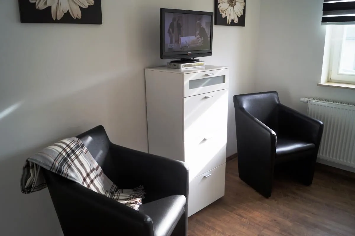 Herzstück der Ferienwohnung ist das großzügige Wohnzimmer mit der offenen Wohnküche. Große Fenster sorgen den ganzen Tag für eine helle und freundliche Atmosphäre. Dazu trägt auch die bis ins Dach geöffnete Zimmerdecke bei. Vom Wohnzimmer aus gelangt man auf den möblierten Balkon. Auch für die Unterhaltung am Abend ist gesorgt: Ein großer LED-TV im Wohnzimmer mit DVD-Player lädt zu langen Film-Abenden ein. Die Küche ist komplett ausgestattet und lässt keine Wünsche offen. Der WLAN-Anschluss kann kostenfrei genutzt werden. Damit Sie im Urlaub keinen Parkplatz suchen müssen, befindet sich direkt hinter dem Haus ein PKW-Stellplatz. Fahrräder können trocken und sicher auf dem Grundstück abgestellt werden.