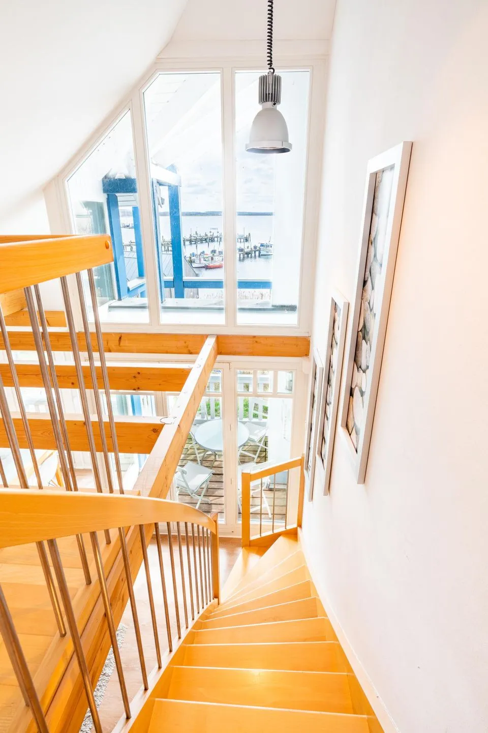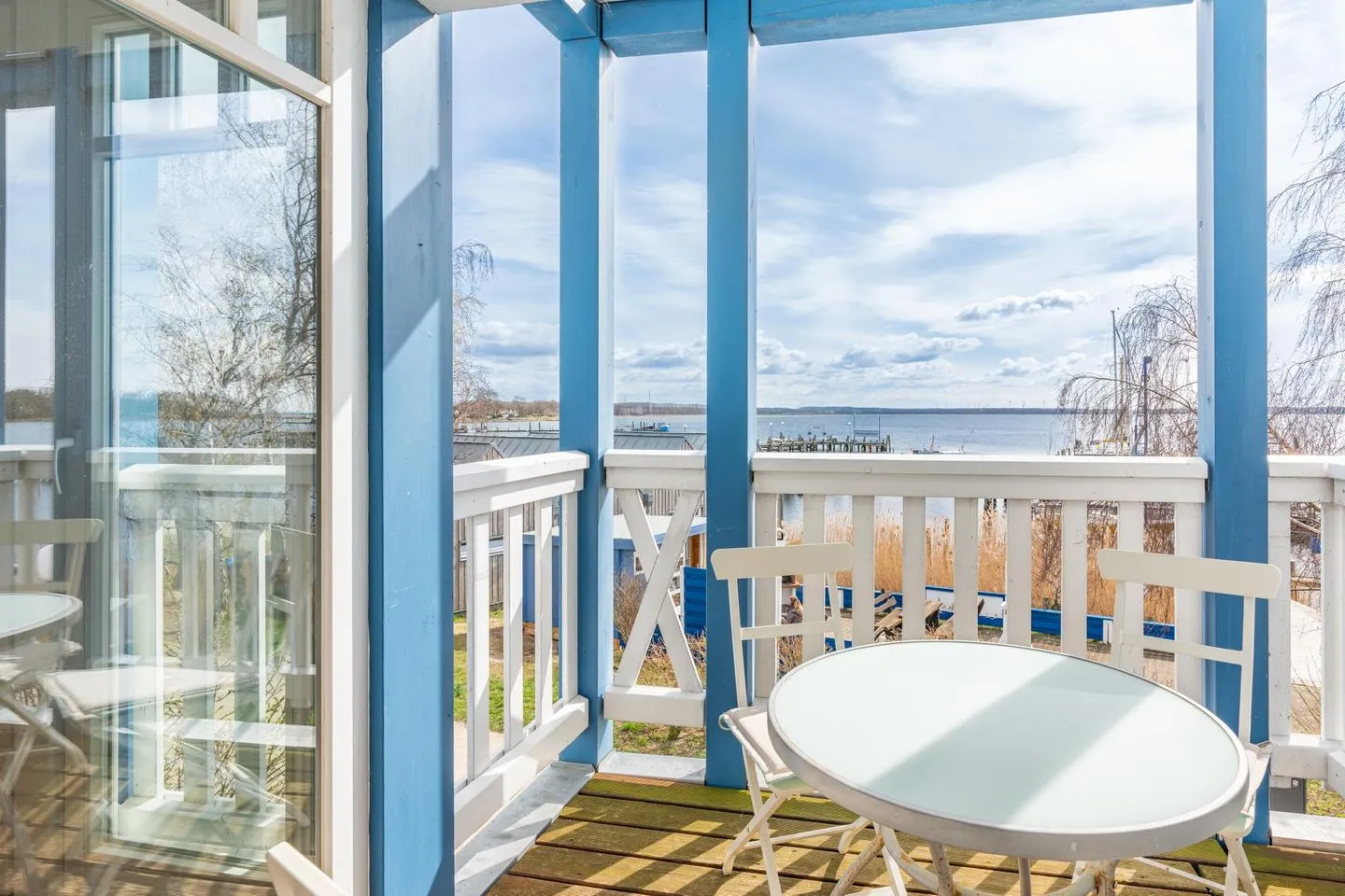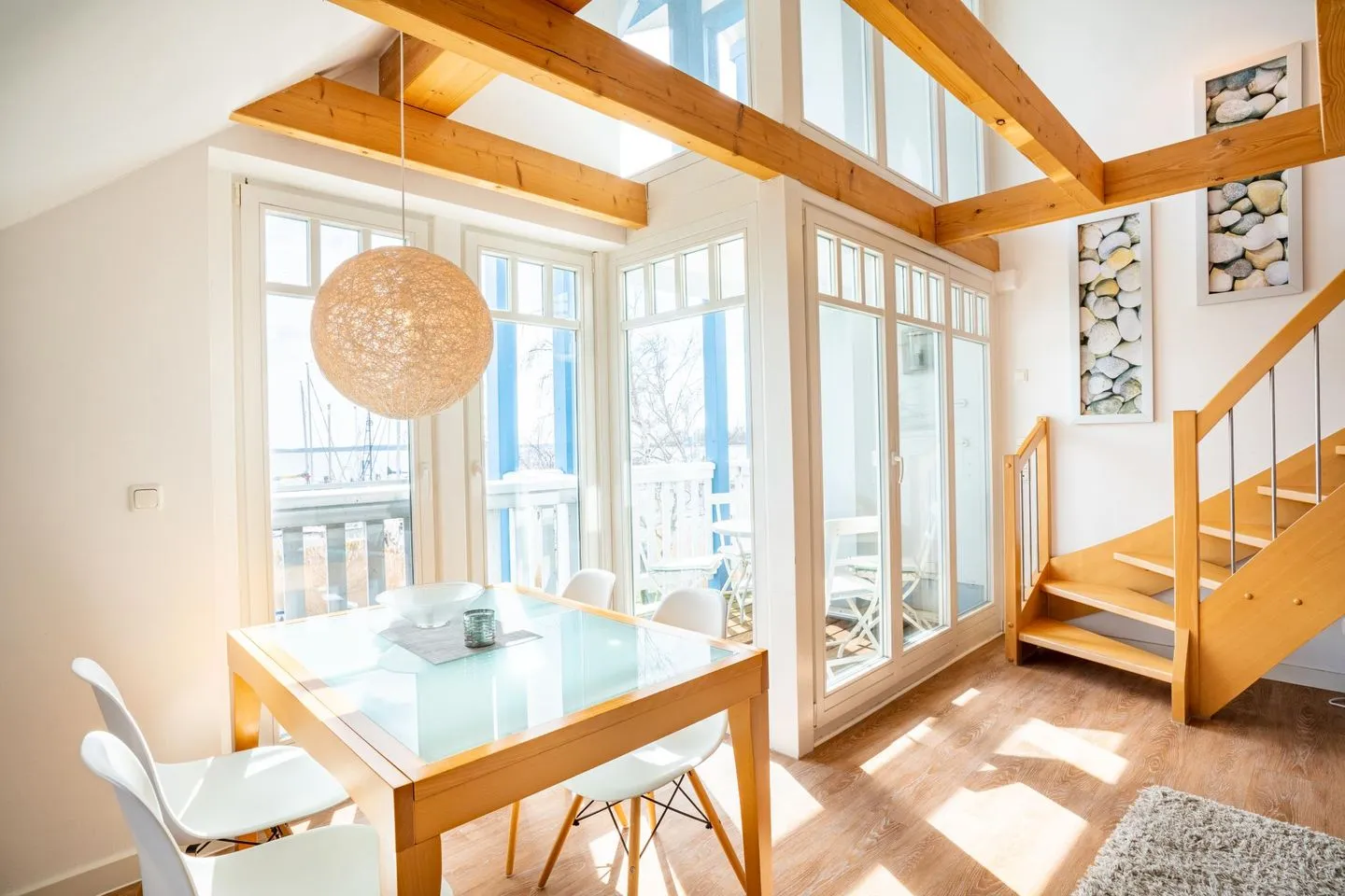Die im skandinavischen Stil eingerichtete Wohnung verläuft über 2 Ebenen und bietet Platz für bis zu 4 Personen. Für eine ganz besondere Atmosphäre sorgt die schöne Holzbalkendecke. Sowohl vom überdachten Balkon als auch vom Wohnzimmer aus genießen Sie einen traumhaften Wasserblick auf das Salzhaff mit seinem kleinen Fischereihafen. Bodentiefe Fenster sorgen nicht nur für eine fantastische Aussicht, sondern auch für angenehme Helligkeit zur dunkleren Jahreszeit. Zu der Wohnung gehört ein PKW-Stellplatz, den Sie kostenfrei nutzen können. Mitgebrachte Fahrräder werden im hauseigenen Fahrradschuppen sicher abgestellt.