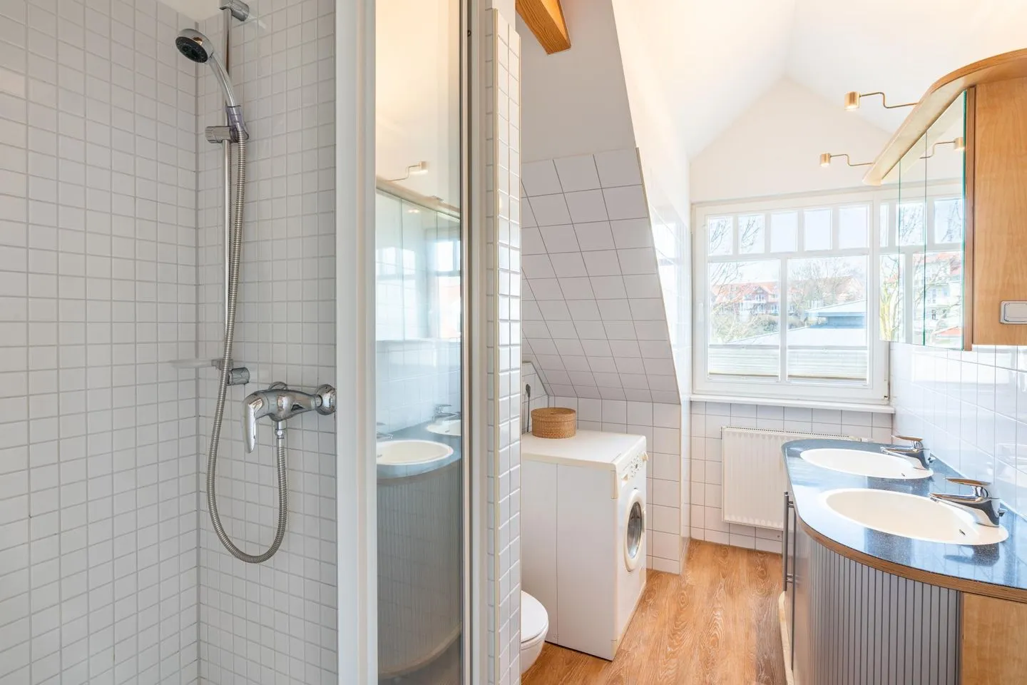 Das Tageslicht-Bad verfügt über eine Dusche, zwei Waschbecken sowie ein Waschmaschinen-Trockner-Kombigerät. Auch ein Fön ist vorhanden.
