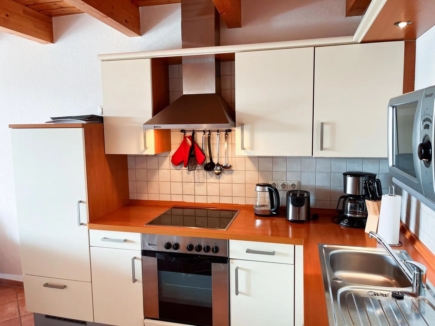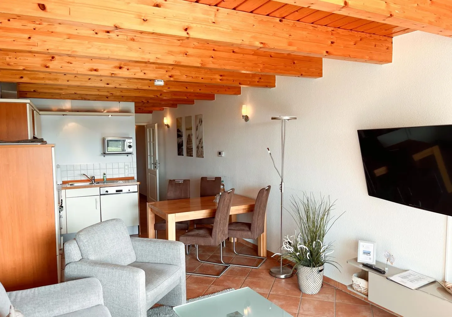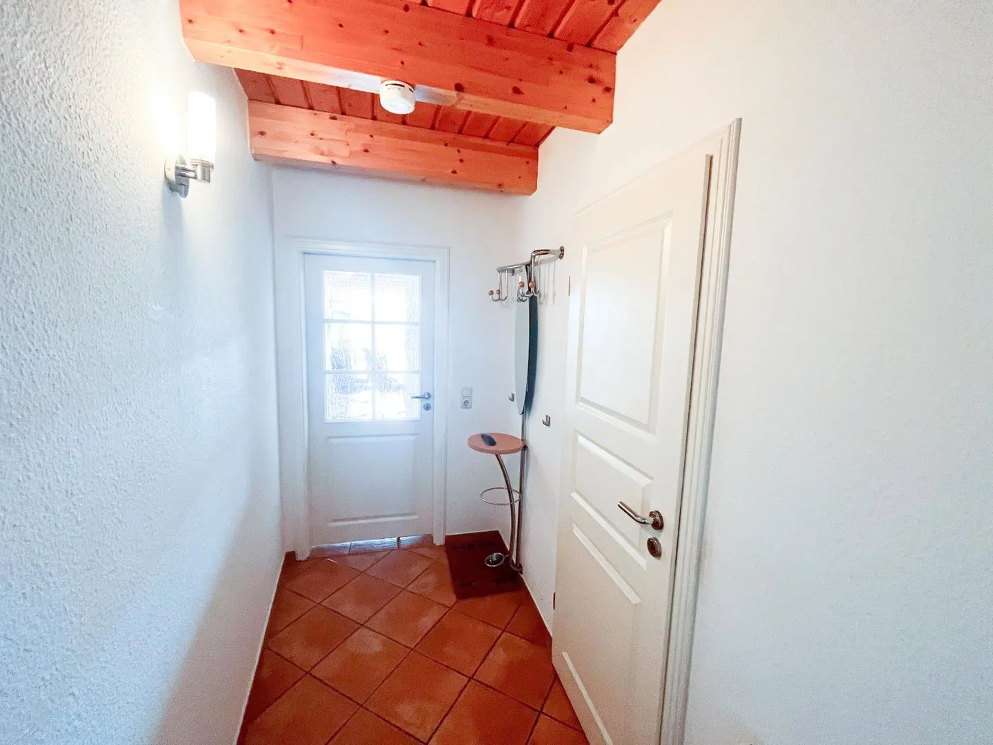 Im Erdgeschoss des Hauses befindet das gemütliche Wohnzimmer. Eine schöne Holzbalkendecke sorgt für besonders heimelige Atmosphäre. Die Küchenzeile ist im Wohnraum integriert und verfügt zusätzlich über einen schönen Sitzplatz zum Essen.