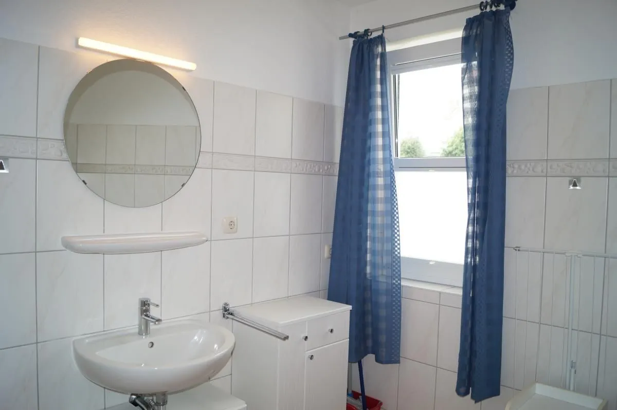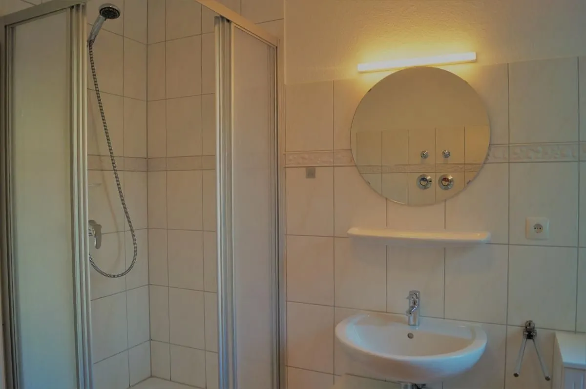 Das helle und in frischen Farben gehaltene Badezimmer hat ein Tageslichtfenster. Es gibt eine Dusche, ein Waschbecken sowie eine Toilette. Auch ein Fön liegt bereit.