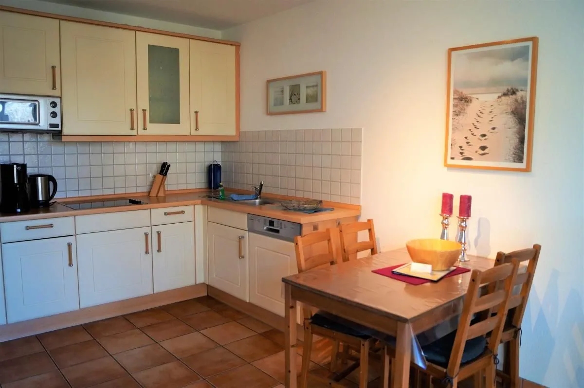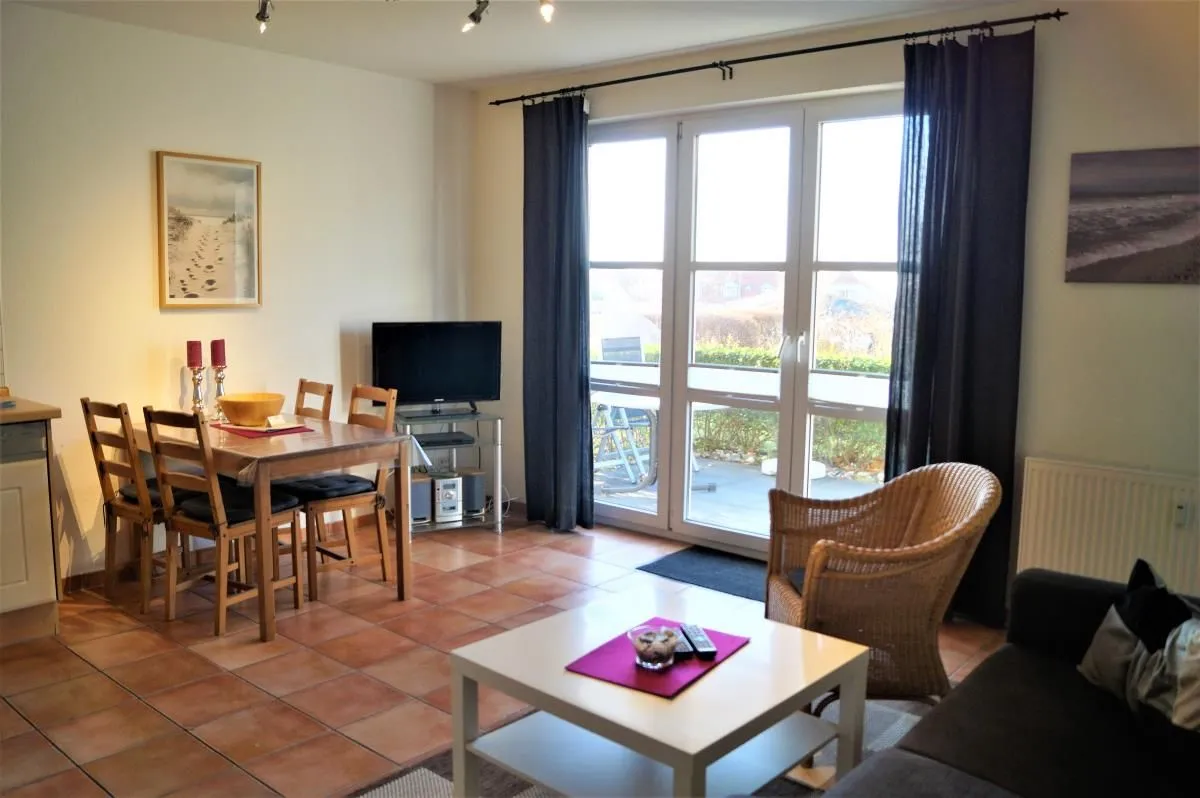 Im Wohnraum gibt es eine gemütliche Sitzgruppe mit Blickrichtung zum modernen Flat-TV bzw. zur Terrasse sowie eine integrierte Küchenzeile mit eigener Essgruppe. Hier kann natürlich auch geschrieben, gespielt oder gebastelt werden - der Tisch bietet dafür ausreichend Raum. Die Küchenzeile ist mit einem modernen Cerankochfeld, einer Mikrowelle sowie Geschirrspülmaschine und Kühlschrank ausgestattet. Die Frühstücksbrötchen können auf kurzem Wege beim Bäcker direkt in der kleinen Ferienanlage gekauft werden. Es gibt ein Badezimmer sowie eine großzügige Terrasse.